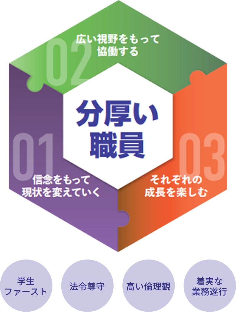 - 大学業界のみならず社会の動向に目を向け、新たな発想や多様な視点を取り入れる。
